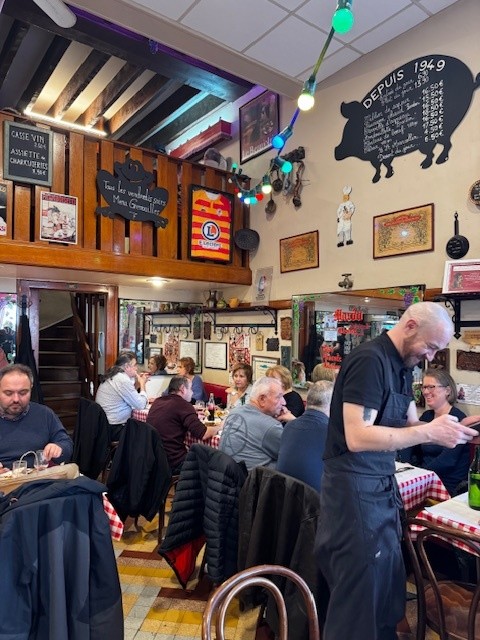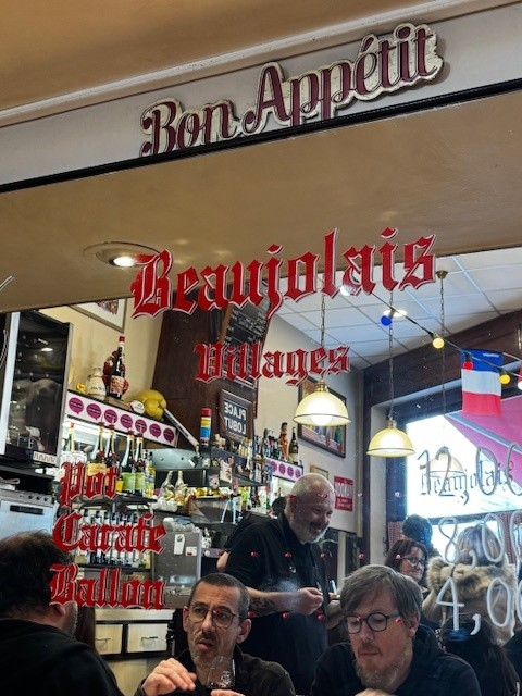 CH: No cambiamos casi nada. Esta casa existe desde 1949. Originalmente era un bar de vinos, sin restauración. El hijo del dueño era charcutero. Cuando se incorporó al negocio en los años 70, añadió una cocina para ofrecer comidas. La cocina se construyó en el patio del edificio. También construyó el entresuelo. Hicimos obras de renovación (pintura, techo…), cambiamos los bancos. Por lo demás, todo está tal como estaba. Solo añadimos algunos objetos decorativos que Sandrine encontró en mercadillos.